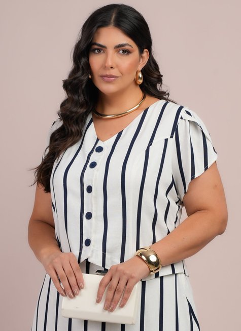 A parte superior apresenta botões frontais decorativos (não funcionais) e decote em V discreto, valorizando o visual com sofisticação.