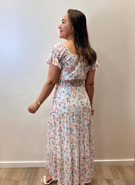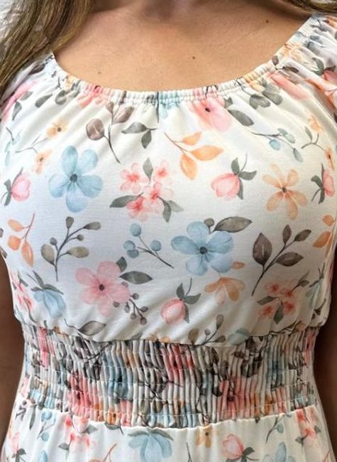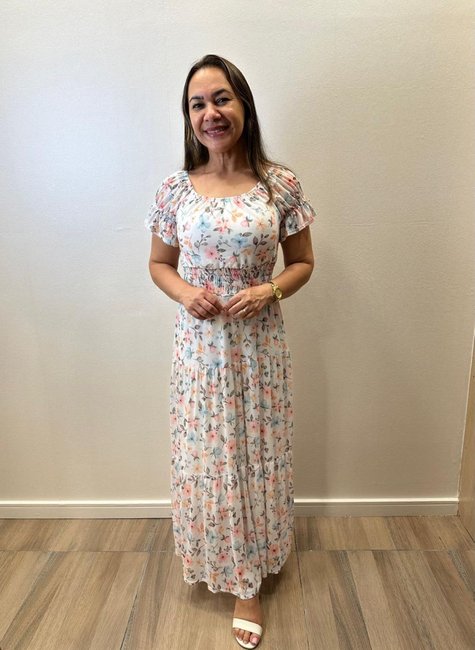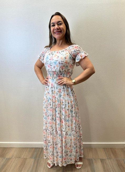 Com manga princesa com elástico e elastex na cintura, o vestido se adapta ao corpo de forma elegante, valorizando a silhueta. A gola elástica permite o uso modelo ciganinha, dando liberdade para variar o visual. Ideal para quem busca um vestido romântico, discreto e atemporal, o modelo combina com sandálias, saltos ou até rasteirinhas em eventos diurnos e noturnos.