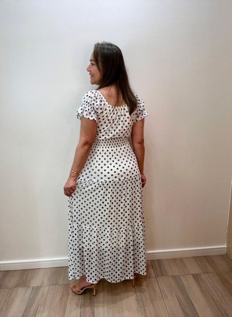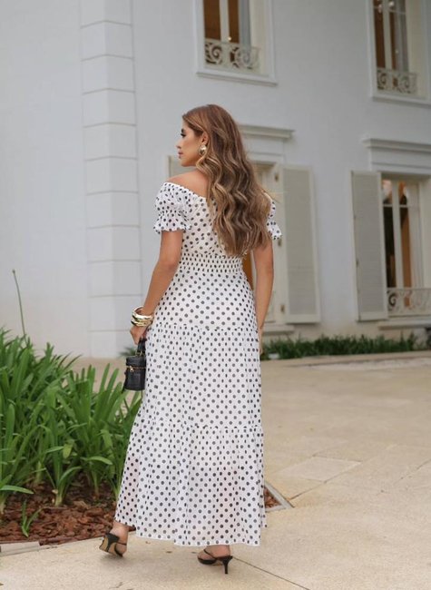 Com manga princesa com elástico e elastex na cintura, o vestido se adapta ao corpo de forma elegante, valorizando a silhueta. A gola elástica permite o uso modelo ciganinha, dando liberdade para variar o visual. Ideal para quem busca um vestido romântico, discreto e atemporal, o modelo combina com sandálias, saltos ou até rasteirinhas em eventos diurnos e noturnos.