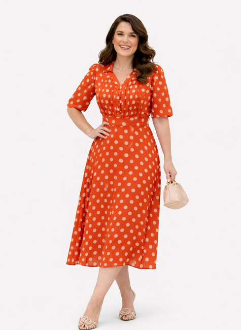 O vestido midi poá feminino com faixa é a escolha ideal para quem busca um visual elegante, moderno e versátil. Com decote V com golinha, cintura marcada e estampa clássica, ele une charme e sofisticação em uma única peça.