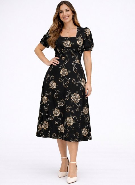 Vestido Midi Preto Floral Elegante em Viscolinho